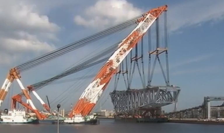 Mixed steel-concrete type scaffolding and longitudinal static scheme of simply supported beams with a span of 40 m; steel structure consisting of four non-symmetrical double T beams arranged at a constant distance of 2.50 m. Steel supplied on site 4,000 tons